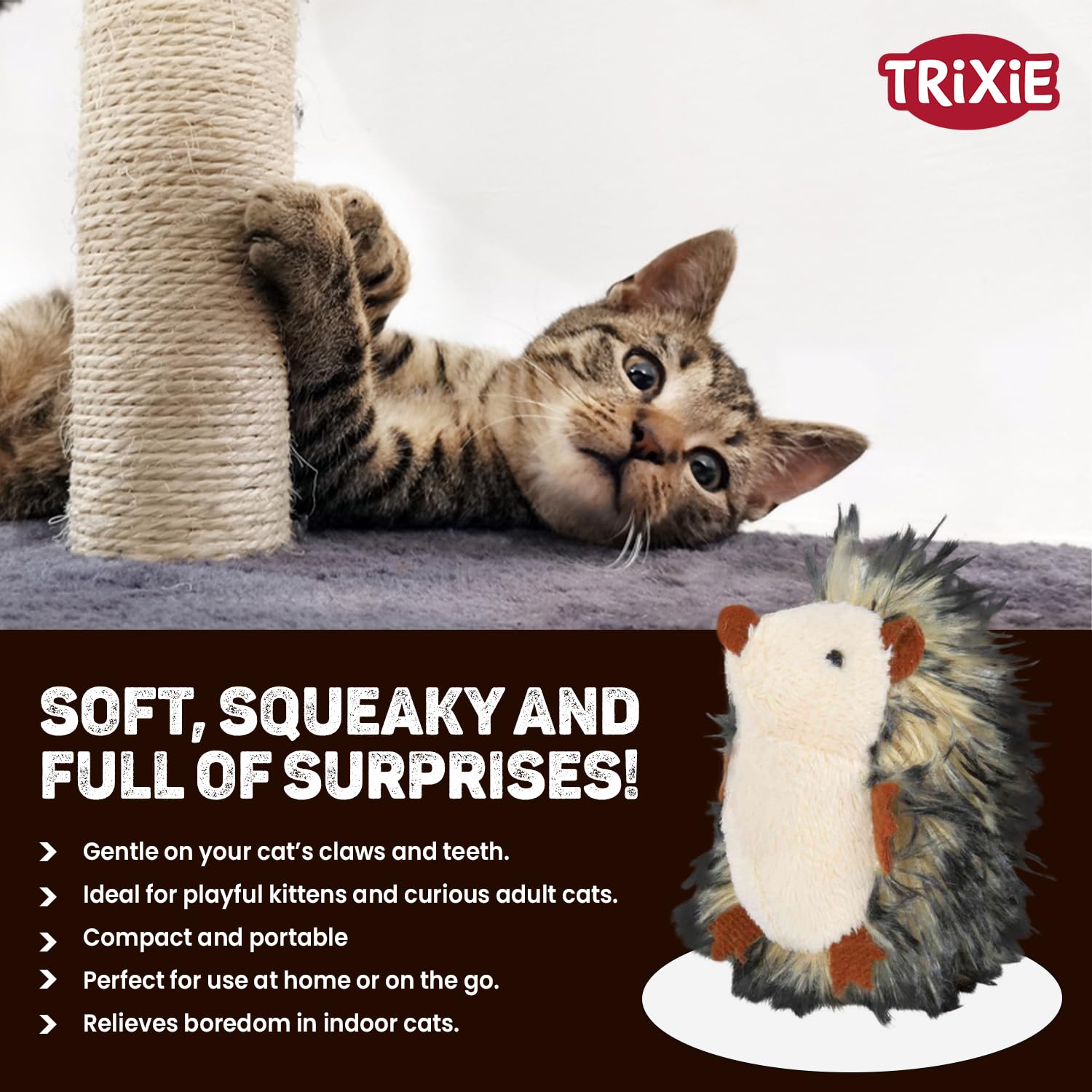 - Plush toy: Our hedgehog plush toy is used to train cats and helps to make them active in nature. This toy stops on touch and starts moving again after renewed contact.
